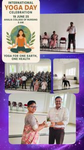 On June 19th,Ahalia college of nursing celebrated International Yoga Day(June 21st) focusing on the theme “Yoga for One Earth,One Health”to honour the practice of yoga and promote its benefits. By Mithu J July 1, 2025 News, Yoga Day